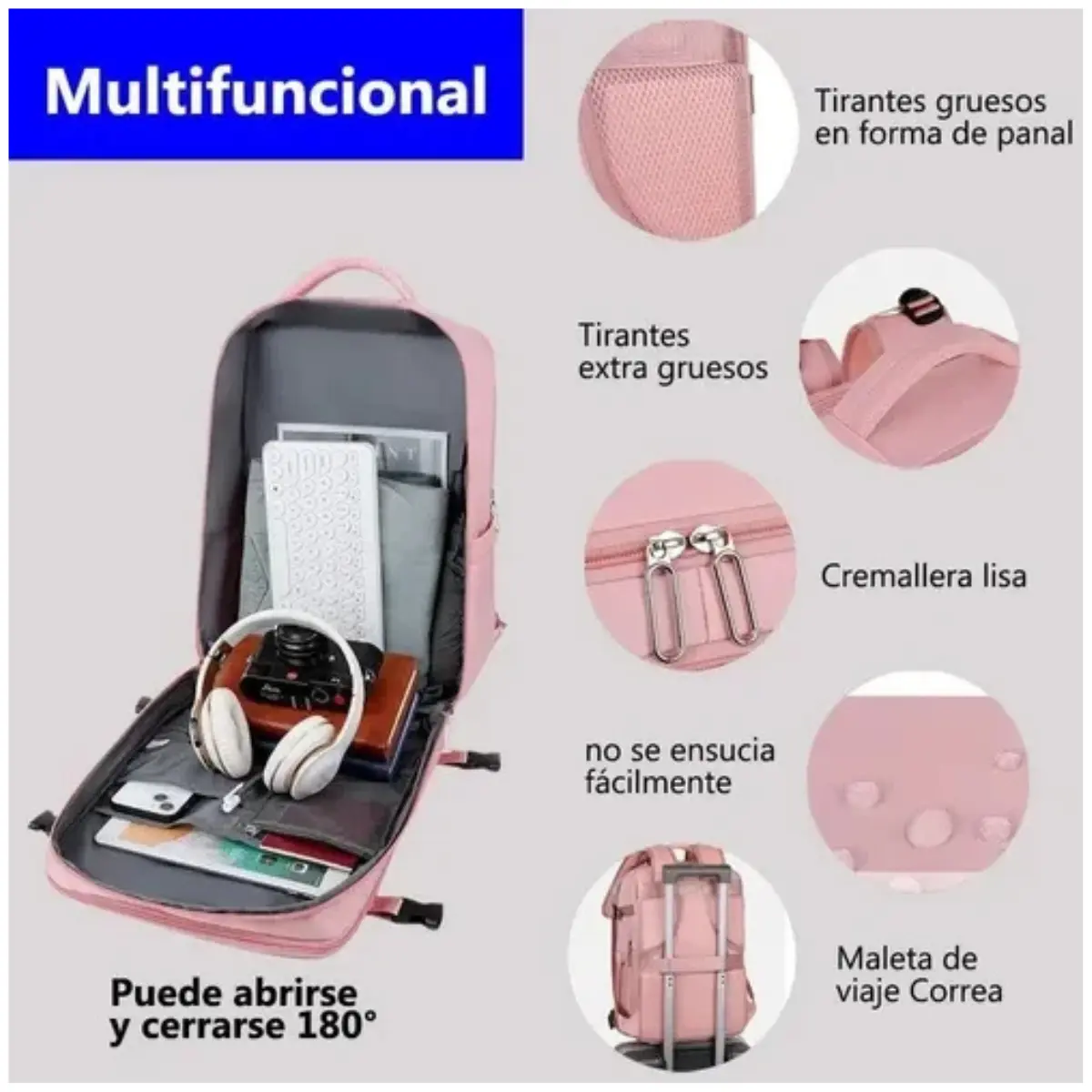 Viajá Cómodo: Tela Oxford impermeable y funda para enganchar en la maleta.
