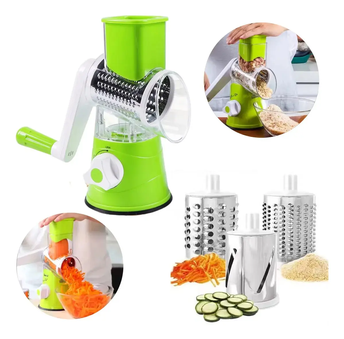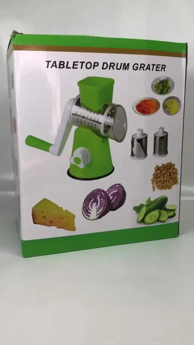 Práctica y eficiente, esta cortadora manual te permite rallar, rebanar y cortar verduras de manera rápida y sin esfuerzo. Incluye 3 tambores de acero inoxidable intercambiables, diseñados para diferentes tipos de corte: fino, grueso y en láminas.